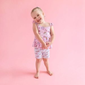 Spaghetti strap bubble rompers are the perfect lightweight summer outfit! Päpook® viscose from bamboo is buttery soft, breathable, and oh so cute! Spaghetti straps, ruffled bodice, and snap closure for an easy diaper change. Sleeveless with a ruffled bodice Inseam snap closure for an easy diaper change Printed ribbed v