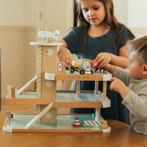 Your little tot will drive into fun with our Little Tot Parking Lot.  Our quality wooden parking lot has 3 floors of imaginary play including ramps, helipad and helicopter, 3-floor crank elevator, 4 motor vehicles, safety cones, signs, gas pump and charging station, and more!  Simple assembly, and you’re ready to go.
