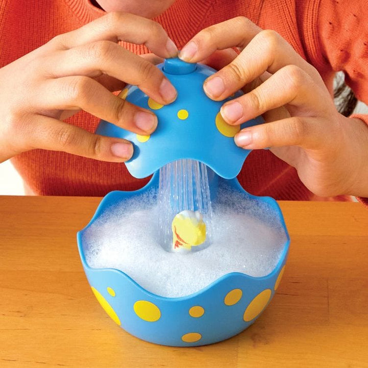 Unleash your creativity with the Discoveryâ„¢ Dinosaur Designer. Color your prehistoric pals, rinse them off in the egg shower, and begin again! This interactive toy set allows children to engage in creative play repeatedly. The set comes complete with a dinosaur egg-shaped shower featuring a working pump and four unique