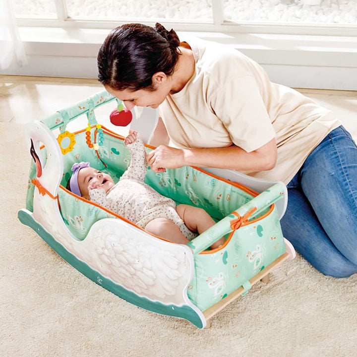 Experience the perfect blend of playtime and soothing comfort with our 2-in-1 Baby Gym and Rocking Swan Chair. Delightful entertainment meets relaxation for your child. EXCITING HANGING TOYS: There are three hanging toys in the baby gym to help with gross motor skill development like arm strength, as well as colour and