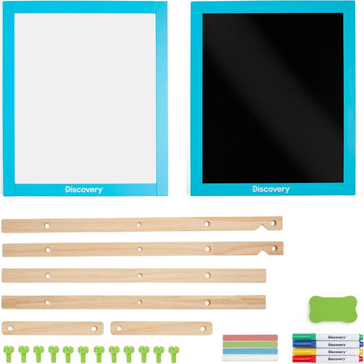 Unlock the potential of young artists with the Discoveryâ„¢ 2-In-1 Easel Wood Art Center, a versatile and engaging art station that features both a whiteboard and chalkboard. This easel features an easy DIY assembly and adjustable angle for comfortable use on tabletops or floors. The integrated storage tray ensures that