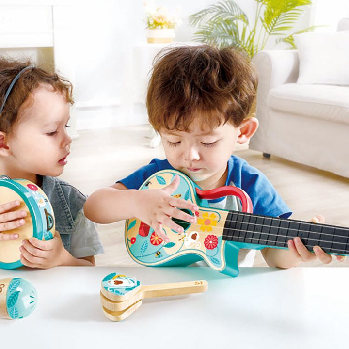 Start your very own band with the bright and vibrant ukulele set. You can invite your friends and family to play your favourite tunes with the realistic ukulele, maraca, tambourine and castanet. PERFECT UKULELE PLAYSET: This playset is made of 4 musical instruments: a maraca, castanet, tambourine and a ukulele. HELPS W