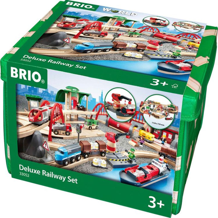 The ultimate BRIO World rail and road set – this 87-piece Deluxe Railway Set comes complete with passenger trains, freight trains, harbor and metro scenes, stations, cranes, bridges, road and rail tracks, figures and more. Full of action and adventure, this BRIO World set helps children explore the world around them in