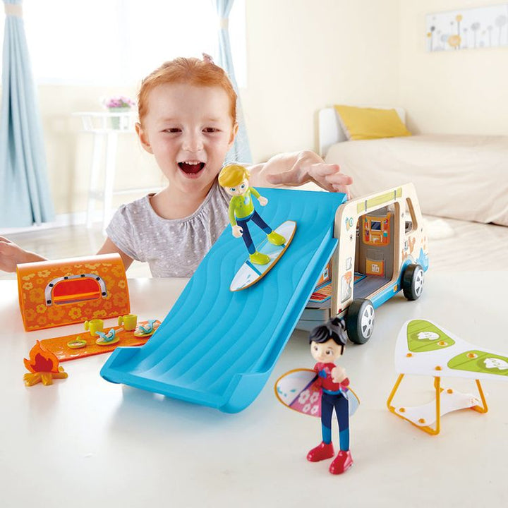 Head out for an amazing camping adventure with picnics, surfing and even hang-gliding with this brilliant, easy-to-carry camper van complete with dolls and accessories! Includes: An adjustable roof – it can quickly be turned into a surfing slide Tent with a campfire and a blanket Space for everything you need for your
