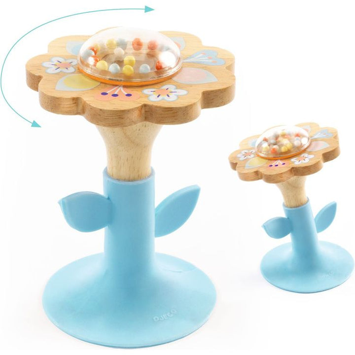 Baby Swipi is a flower-shaped rattle with suction cup designed for babies aged 3 months and up. A soft stem, a flower made of natural wood and a clear heart filled with colorful little beads. As you spin it around, the beads in the flower will make a sound. Thanks to the suction cup, your child can enjoy tapping on the