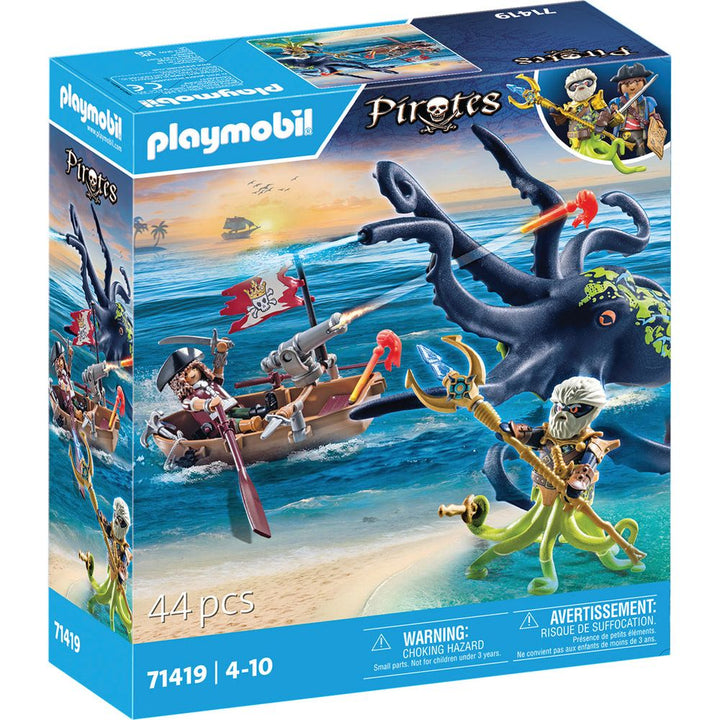 It's eight giant octopuses legs versus two pirate legs at the Battle of the Giant Octopus! Who will win? Watch as the sea monster splashes real water from its tentacles as the pirate tries to escape in his rowboat with functioning cannons. The boat floats and fits one figure inside. Combine with other PLAYMOBIL Pirate