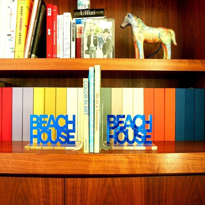 The blue mirror will make these BEACH HOUSE bookends really pop on your bookshelf! Material Content: Acrylic Care/Wash Instructions: Wipe Down PLEASE NOTE: this item does not qualify for free shipping. Due to item size/weight there is a shipping fee associated with this item.Â