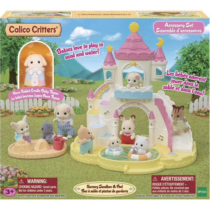 The Nursery Sandbox & Pool set is perfect for the nursery. It comes with a Flora Rabbit cradled baby, Thyme. The castle has windows where the babies can peek out from and a big slide. Comes with cute toys for playing in the sandbox and pool, including a bucket, scoop and ball. The pool has swimming rings that the b