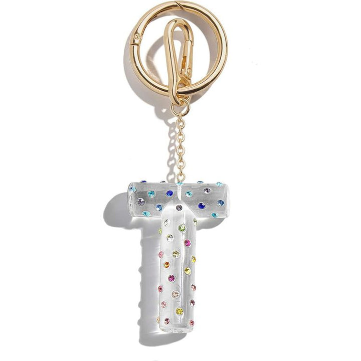 Add some vibrant hues to your bag with the Confetti Initial Bag Charm. Featuring the letter of your choosing in a bold, bubble-letter font, embellished with dainty multicolored stones for added sparkle.  Keychain closure Clear initial with rainbow studded gemstones. Dimensions: 5.07" x 2.4"   Ages 3+ Materials: 60% res