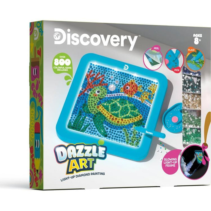 Create, light up, and display with the Discoveryâ„¢ Dazzle Art Light-Up Diamond Painting Kit. This comprehensive craft kit lets you dive into the world of diamond art, featuring over 800 gems and a special adhesive art sheet to diamond paint a vibrant sea turtle. Illuminate your finished piece with the built-in LED light