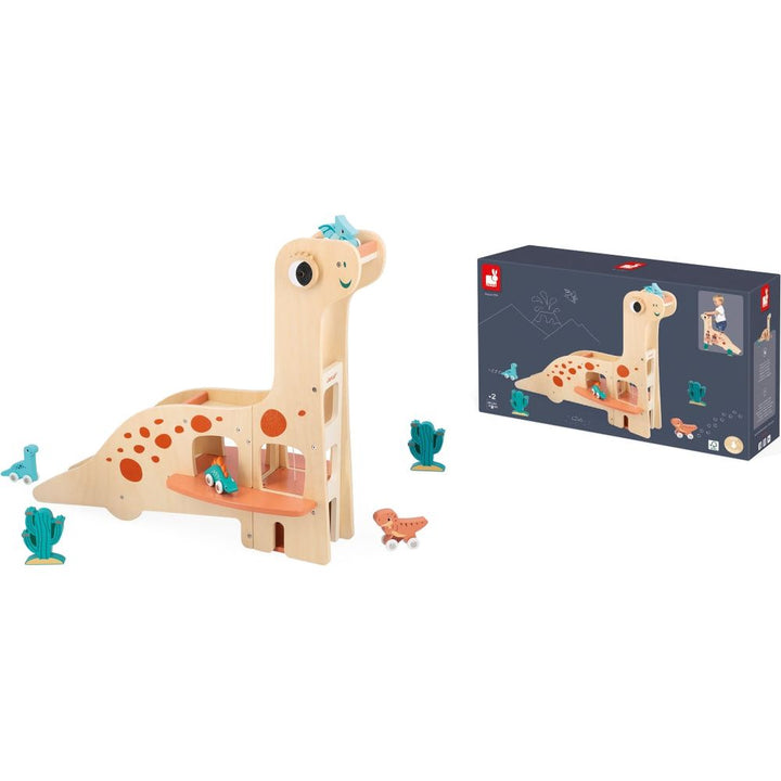 VRRRoom! Back to the pit for the T-rex! Here is a magnificent garage in the shape of a diplodocus. The 4 rolling dinosaurs can go off for a jaunt and come back to the garage to rest… The garage is equipped with a lift allowing direct access to the first and second floors. To get back down? There are two possibilities