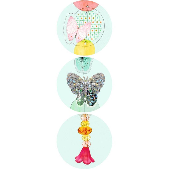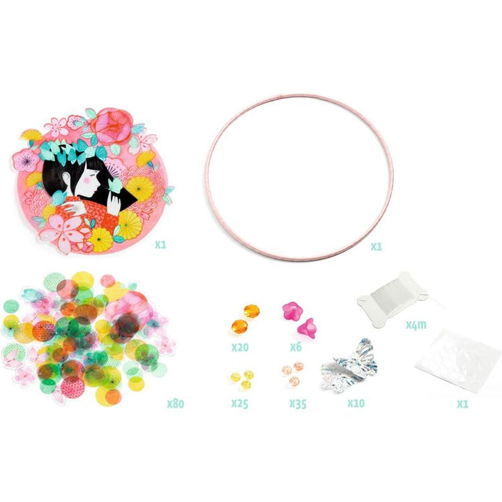 Introducing a comprehensive creative kit that allows you to create a beautiful and poetic suncatcher. With this kit, you can decorate the hoop with all the included pieces, such as decorative shapes, beads, ribbons, and transparent discs, to make a unique and stunning decorative object.Hang it in your bedroom near a wi