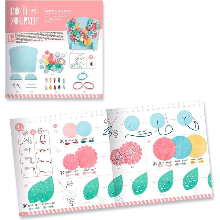 A comprehensive creative kit to make an embroidered multi-row necklace. Flat-stitch embroidery is used on the pre-punched beads to make it easier to pass the needle through. Once embroidered, simply attach the flat rubber bands to the back of the beads to assemble them, creating 3 necklaces that you can wear on their o