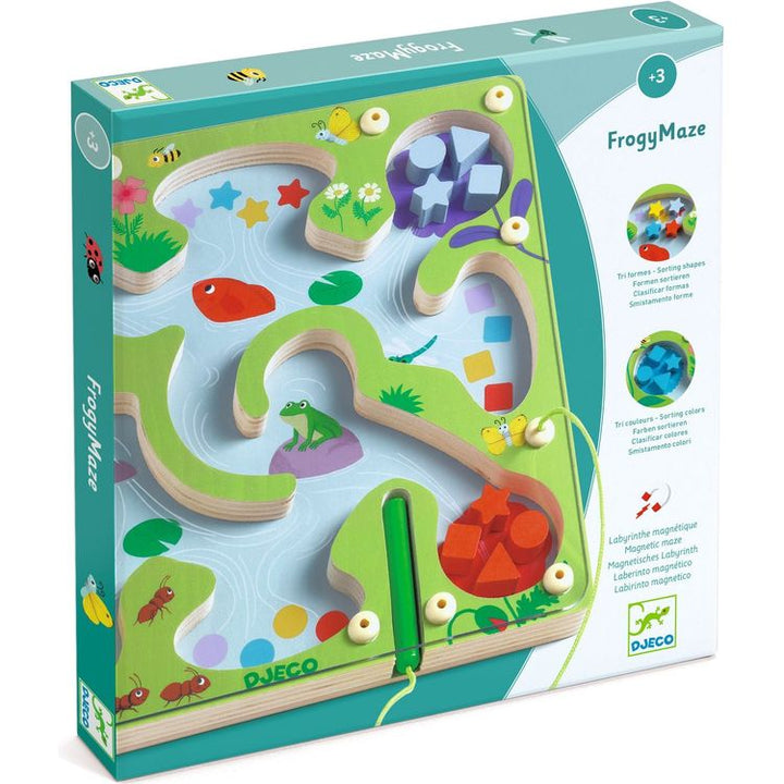 FrogyMaze is a magnetic sorting game for ages 3 and up. Using the magnetic pen, move the pieces according to their shape and color to sort them into the 8 spaces on the board. The "color" spaces are identified by a colored flower, and the "shape" spaces show the different pieces to be sorted. You'll need to travel alon