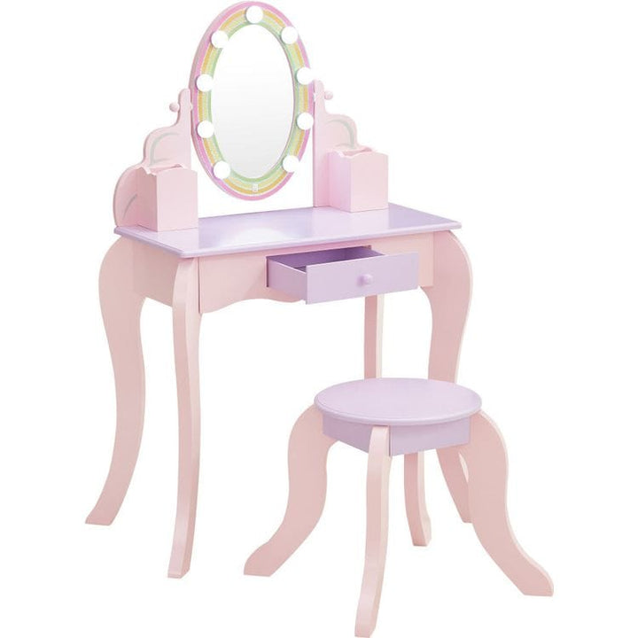 Fantasy Fields' Little Princess Rapunzel Vanity Playset is a fun addition to playing dress-up. Made of engineered wood with rounded corners and carved cabriole legs, the vanity table features an acrylic oval mirror, surrounded by LED lights. In pink and lavender, it features a rainbow accent around the mirror, where an