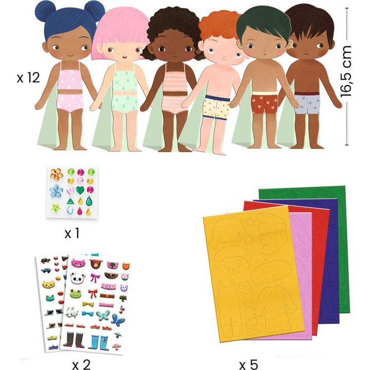 Allows your child to design outfits and styles for 12 characters – 6 boys and 6 girls. With elements of self-adhesive felt, stickers and crystals, each character can have a unique look that reflects the imagination of the toddler. By choosing and matching outfits and accessories, the child exercises precision, percepti