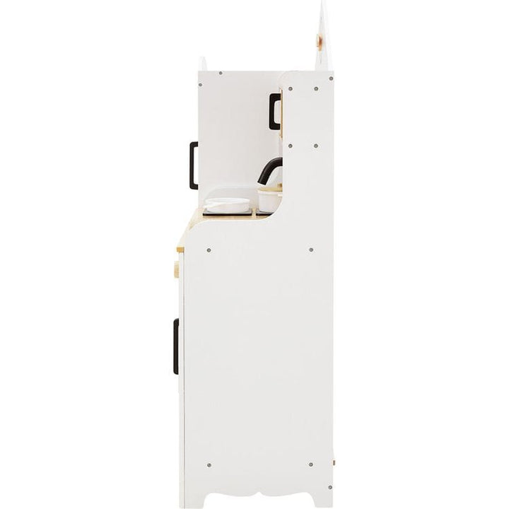 Teamson Kids Little Chef Morocco Play Kitchen features a freestanding refrigerator and a separate unit with oven, washer, microwave, and sink for endless configurations. The Moroccan-inspired blue, black & white tile backsplash and faux rattan oven, washer, and microwave doors are a stylish addition. Includes an in