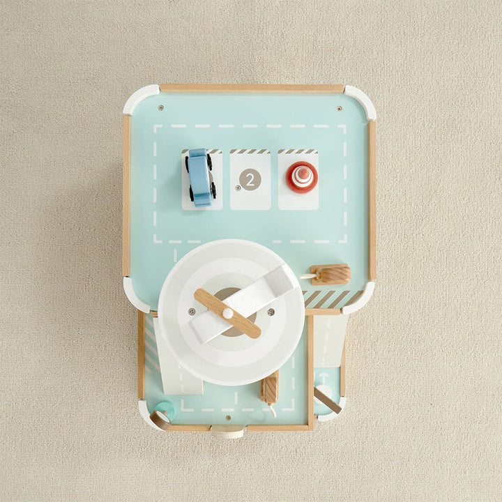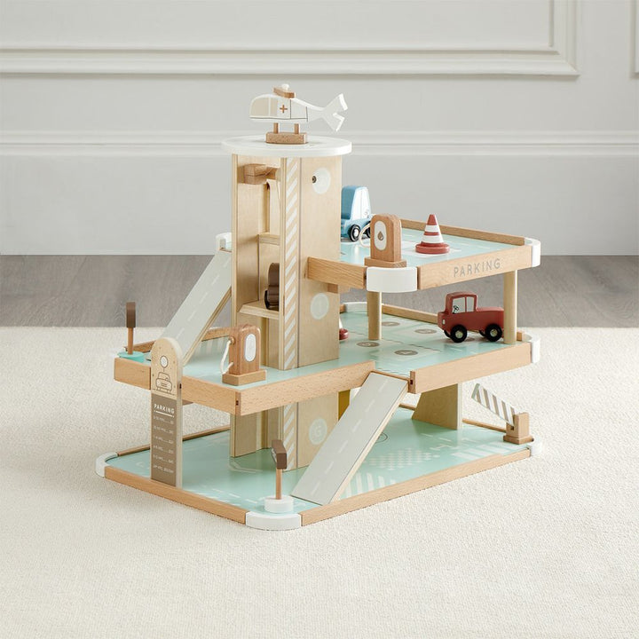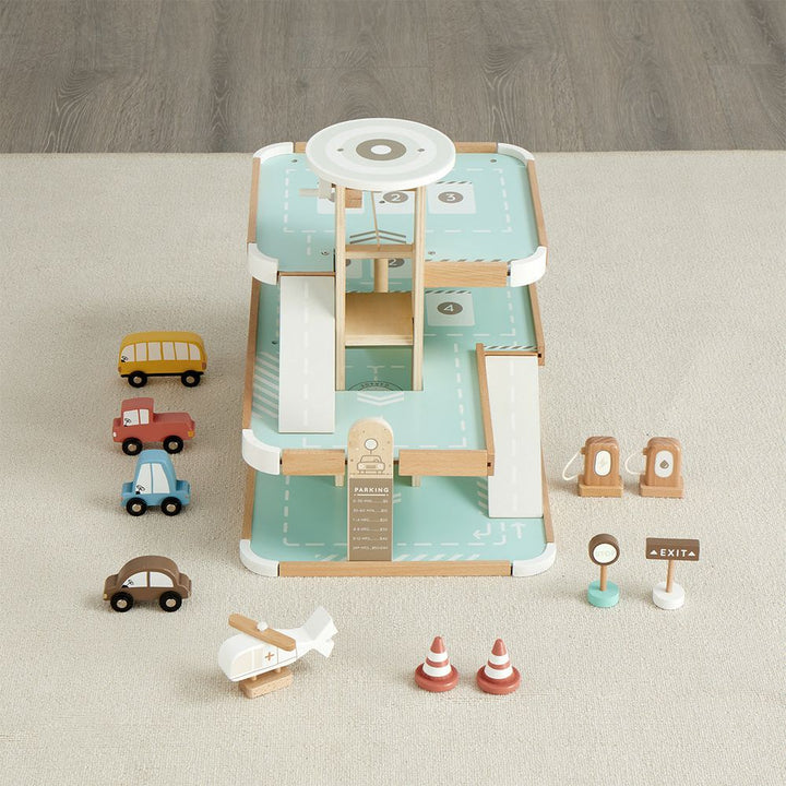 Your little tot will drive into fun with our Little Tot Parking Lot. Our quality wooden parking lot has 3 floors of imaginary play including ramps, helipad and helicopter, 3-floor crank elevator, 4 motor vehicles, safety cones, signs, gas pump and charging station, and more! Simple assembly, and you’re ready to go.Â