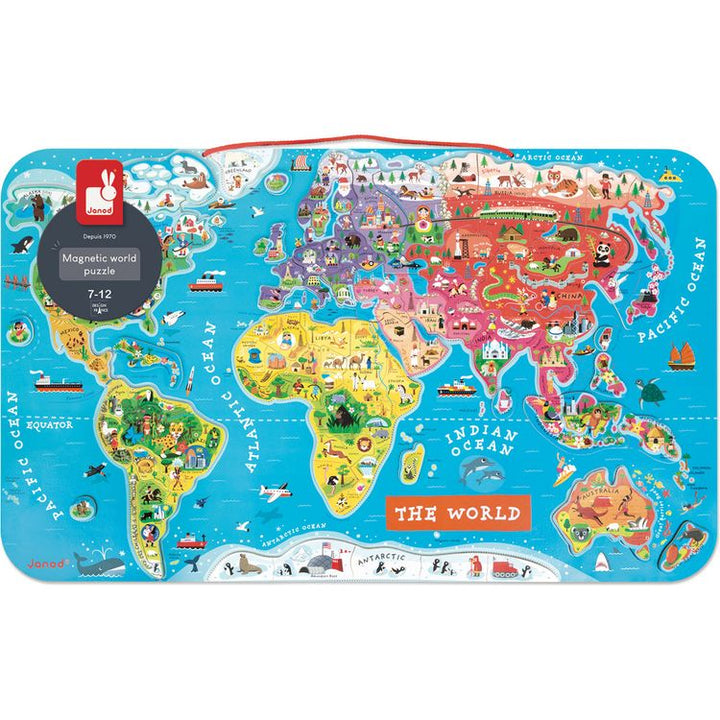 Around the world in 92 magnets! A fun and educational way of discovering the planet. Each magnet represents a country or region of the world, with its name, capital and an illustration characteristic of that part of the world. The big magnetic board shows the world with its continents and oceans: the colour used for ea