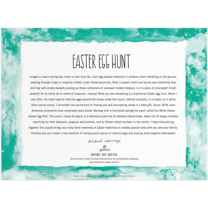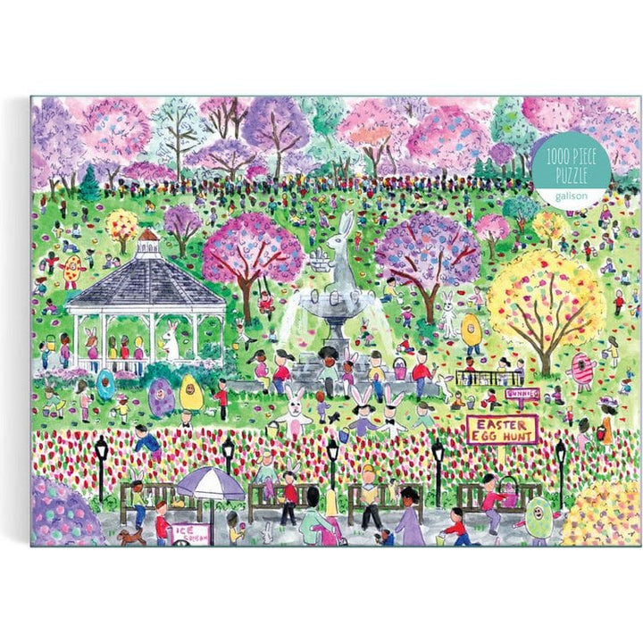 Award-winning designer, illustrator, and creative director Michael Storrings captures the spirit of Easter festivities with lawns full of happy children searching for treasures in a whimsical park. The Michael Storrings Easter Egg Hunt 1000 Piece Puzzle is complete with sherbet-colored trees, an Easter bunny fountain,