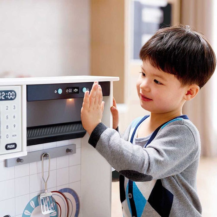 Explore the possibilities of cooking with Hape's interactive kitchen set, equipped with realistic accessories, lights, and sounds. Encourage your children to learn and practice skills like washing and cutting vegetables, using the smart hood and stove, and tidying up after meals. Item Weight: 18.96 lb Product Dimension