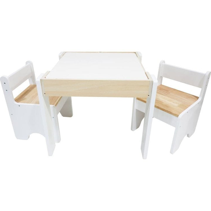 This sturdy wooden 3-piece children's set features a lightweight design and a double-sided tabletop that flips between a building block baseplate and a dry-erase surface, keeping little ones entertained for hours. Build masterpieces, then flip the tabletop over for drawing and learning – perfect for budding artists and