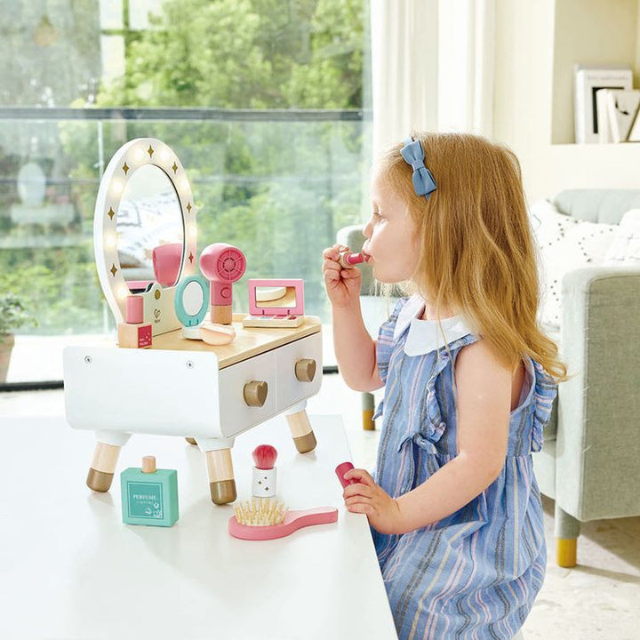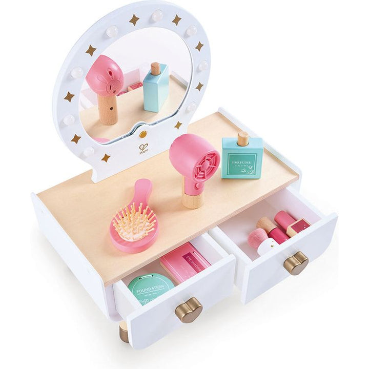 Introduce your child to beauty with this stylish dressing table. Fostering creativity and fine motor skills, children explore makeup artistry, encouraging self-discovery and confidence. This elegant dresser features lights, a mirror, a functional hairdryer, and various makeup pieces that can be neatly stored in the two