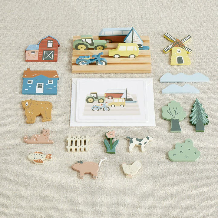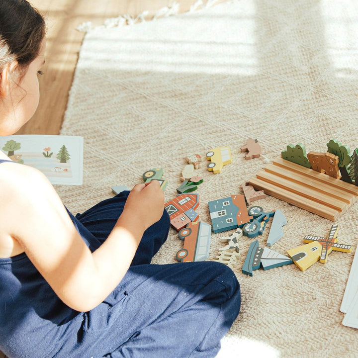 Our My Town Picture Matching Game is a great and fun way to help your kiddos learn placement and sequencing by matching the wooden objects to the pictures.  Our high-quality  set includes a chunky wooden base that holds 21 assorted vehicles, trees, houses, bikes and more.  12 cardboard pictures with scenes to match.  L