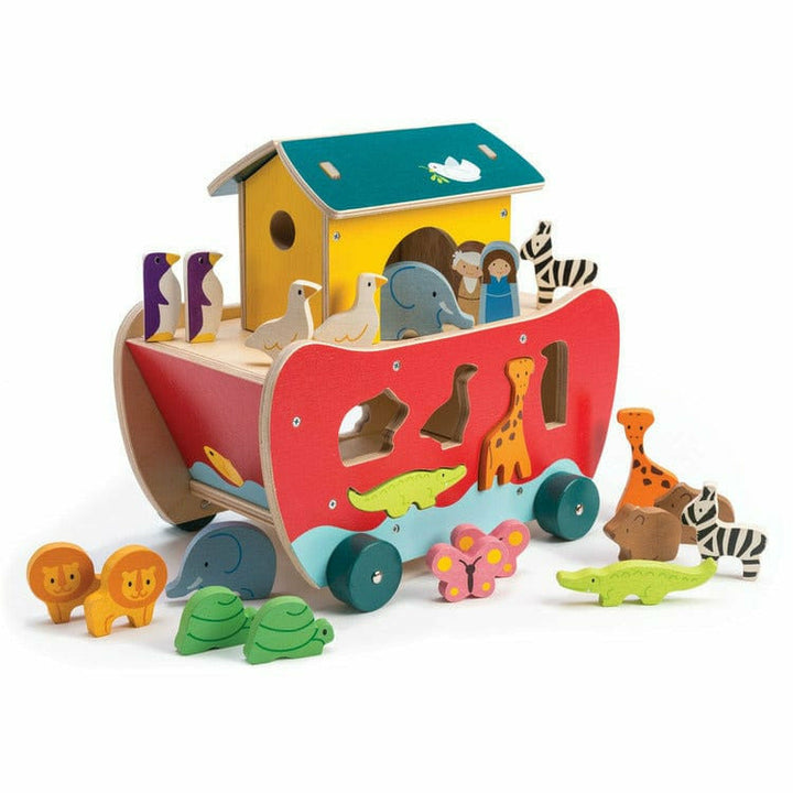 Ark with removable roof panels and side panels, Mr & Mrs Noah, 2 elephants, 2 crocodiles, 2 penguins, 2 lions, 2 butterflies, 2 bears, 2 geese, 2 giraffes, 2 tortoises, 2 zebras. PREMIUM SHAPE SORTER – You want the very best for your child and this toy delivers. Made from the highly renewable rubber tree wood, this
