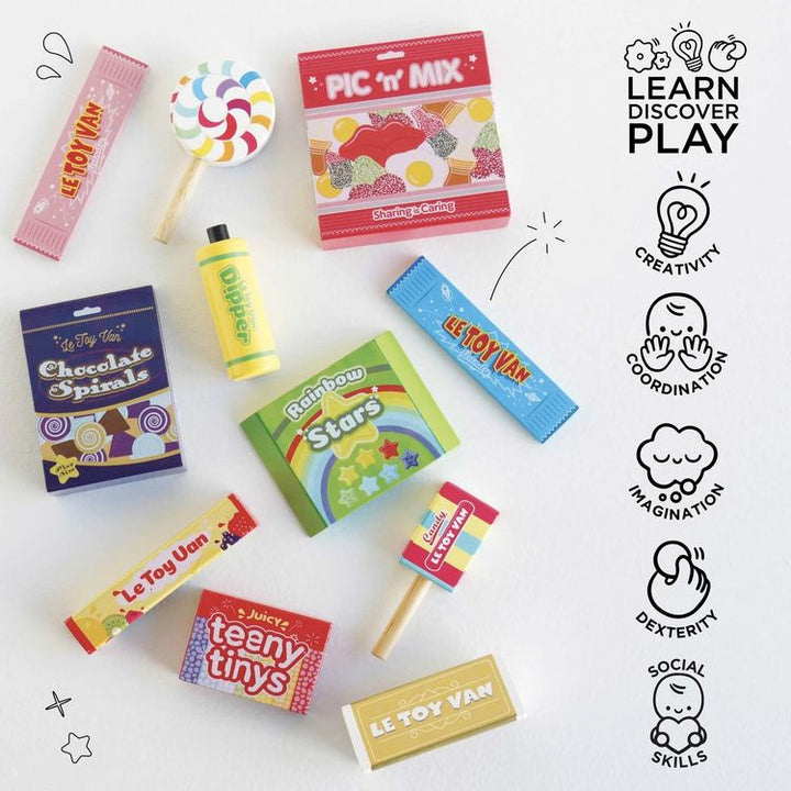 Take a trip down memory lane with this nostalgic Pic 'n' Mix set, made for retro role play fun. Sweet tooth's will delight at this cute set which features an assortment of tasty treats plus a stripy sweetie bag for all the fun without the sugar rush! Each wooden toy sweet is beautifully decorated with unique illustrat