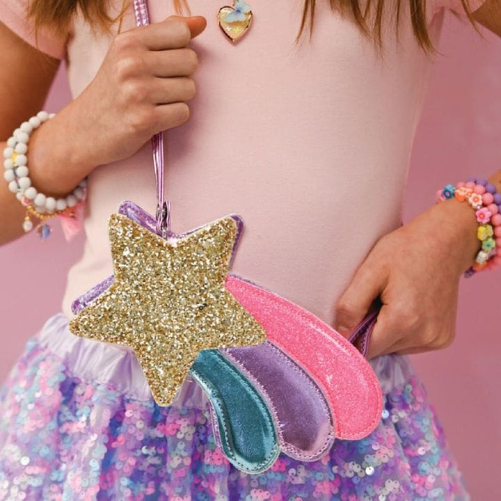 Introducing our brand new Shooting Star Purse, a delightful accessory that will make your little one shine. This charming purse features a gold star embellishment, with vibrant pink, purple and blue accents, adding a touch of magic to their outfit. With its compact size and adjustable strap, it is perfect for little ha