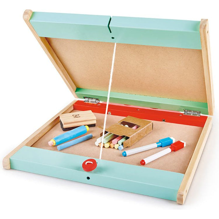 Help your child develop their creativity with the 3-in-1 tabletop easel. Functioning as a chalk blackboard, a magnetic whiteboard, and a sturdy carrying case, it is perfect for an on-the-go aspiring artist. The tabletop artboard features a chalk blackboard for scribbling and writing with chalk and a whiteboard for mark