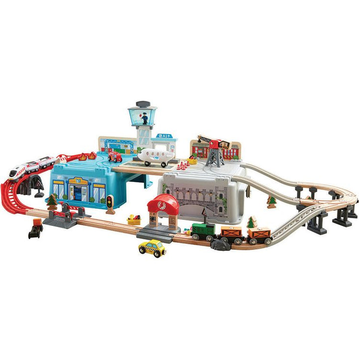 All aboard! With this colorful wooden train set, your little one will role-play as a conductor, an engineer, or a passenger for hours. The battery-powered locomotive has a working headlight and goes forward and backward – but that’s just part of the urban fun. The train station, shops, construction site, airport and op
