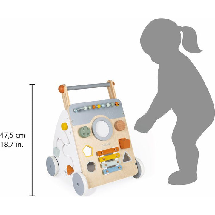 This attractive multi-activity walker is particularly suitable for learning to walk. It will safely accompany children 12 months and up: its invisible and removable brake can lock the wheels and release them gradually so your child can master the speed of the walker while learning. In addition to walking, your child wi