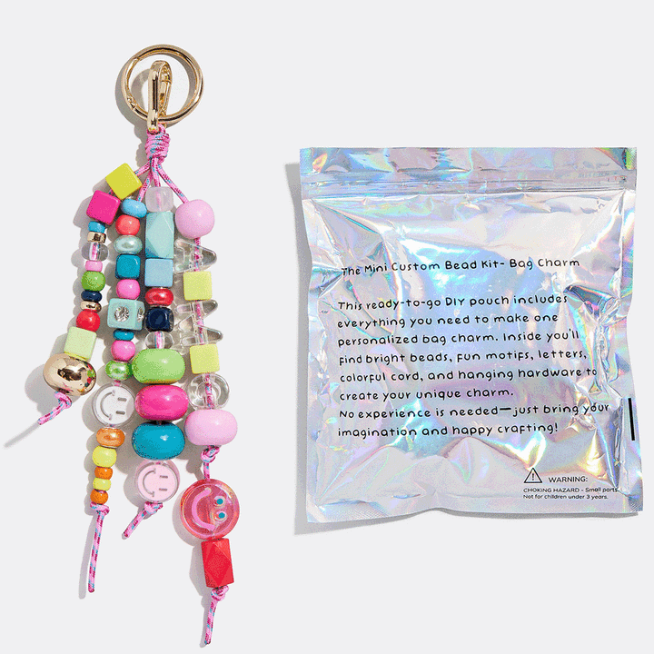 Our Ultimate Bead Kit, turned mini! This ready-to-go DIY bead kit includes everything you need to make one personalized bag charm in a resealable foil pouch. No experience is needed — just bring your imagination and happy crafting! What's Inside: 40+ tonal multi-sized beads 3 smiley face beads 1 complete alphabet (A-Z)