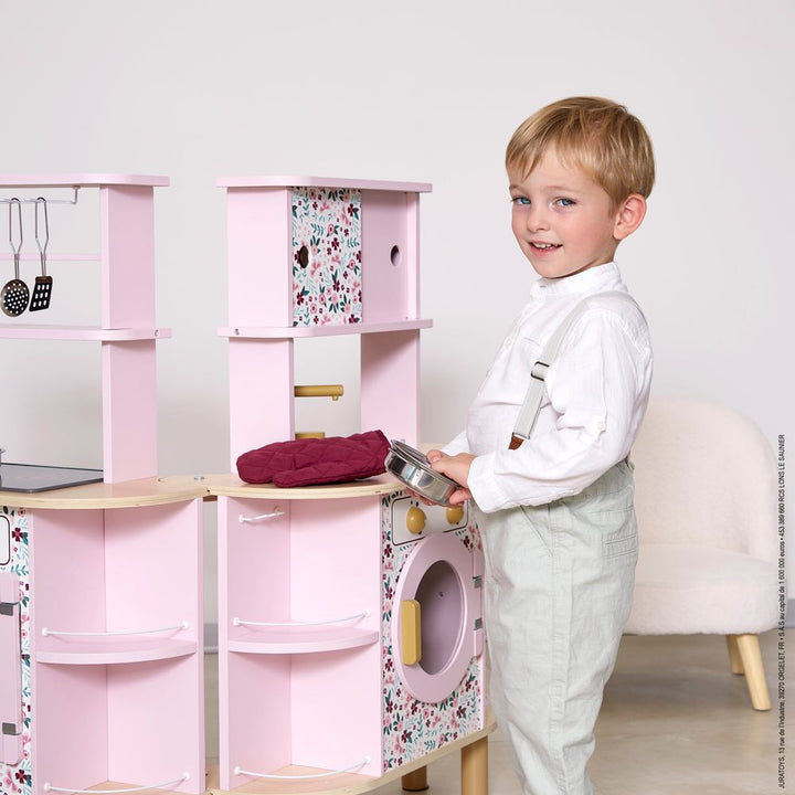 An unfolding double-sided kitchen with a twist! Ideal for preparing delicious meals for several people: this gorgeous wooden kitchen boasts sweet colours and will delight all budding cooks with its many surprises! Need a little more space in the kitchen? We’ve got you sorted… open up the central section to discover w