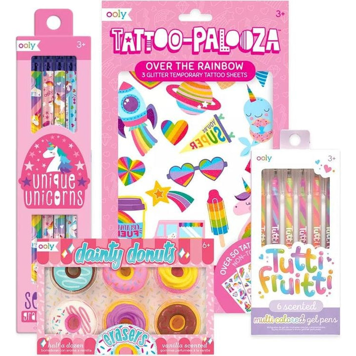 Fill your pages with everything fun and fruity and cool and creative with the Very Beary Sweet Happy Pack! You’ll get a grand collection of fruity scented stickers to match with the Tutti Frutti Scented Gel Pens as well as the Unique Unicorns Graphite Pencils, Dainty Donuts Scented Erasers and now Over the Rainbow Ta