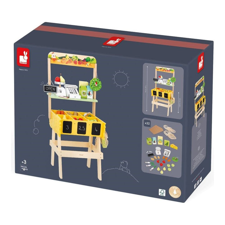 The small producers' market is open! Our wooden Farm Market is the ideal toy for children aged 3 years and up who’ll love pretending to run their own business. This beautiful pretend play toy is equipped with numerous accessories for an enriching and realistic play experience. A total of 58 accessories complete this ch