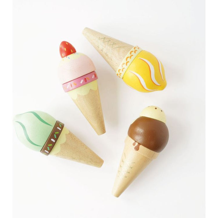 Roll up, roll up! Serve up an icy treat with this sweet set of four, hand painted, ice-cream cones, from our inspired pretend play foods collection. Lovingly crafted from solid rubber wood, complete with a sturdy wooden base, these brightly decorated cones are painted in fresh colours and finished with gold detailing.