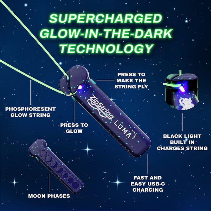 Take your imagination to the moon with ZipString Luma. It's the ultimate glow-in-the-dark toy that balances forces of gravity, lift, tension, and drag to fly looped string in the air for amazing tricks! This multi-functional marvel covers all bases, from lively lasso challenges to mind-bending finger manoeuvres that wi